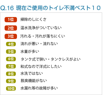 - ●タンクと便座の隙間のそうじがしにくい。掃除しやすく汚れが目立たない色だとうれしい。